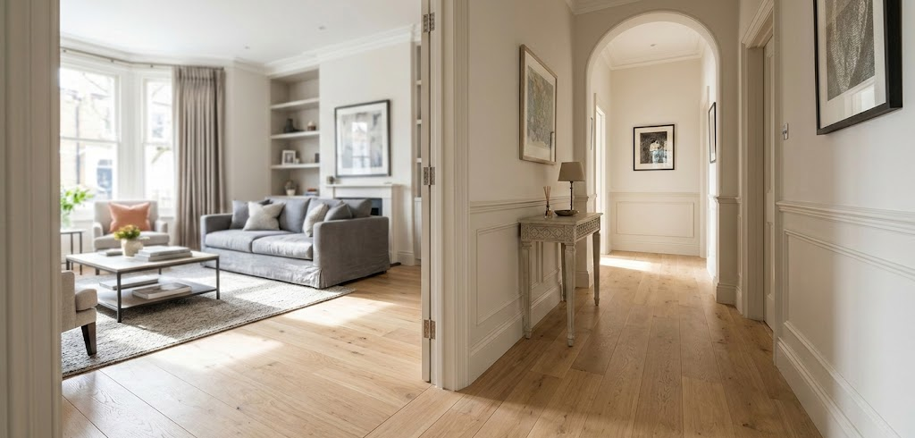 In the UK, wide plank engineered oak is a sign of luxury because it feels solid. If you want to create a sense of elegance, think about using light oak in a herringbone or even chevron pattern. These designs help the room feel more spacious in smaller London reception areas.