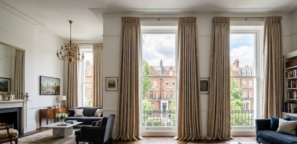The way you dress your windows can change how tall and spacious a room feels. Many people hang curtains just above the window frame, which can make the ceiling seem lower. To create a luxurious look, hang your curtain tracks close to the ceiling and let the fabric reach the floor. This vertical line makes the room feel taller, which is often lacking in typical UK homes.
